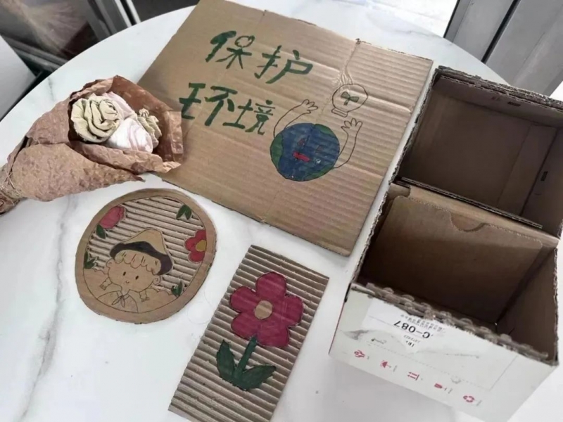 通過觀看環保宣傳短片,同學們了解了綠色環保方式,積極討論快遞盒改造再利用方法,用快遞盒繪制環保宣傳海報,用畫筆盡情創作。在繪制的過程中,同學們不僅收獲了快樂,為單調的快遞盒增添新意,綠色環保理念還深入了每位同學的心中。