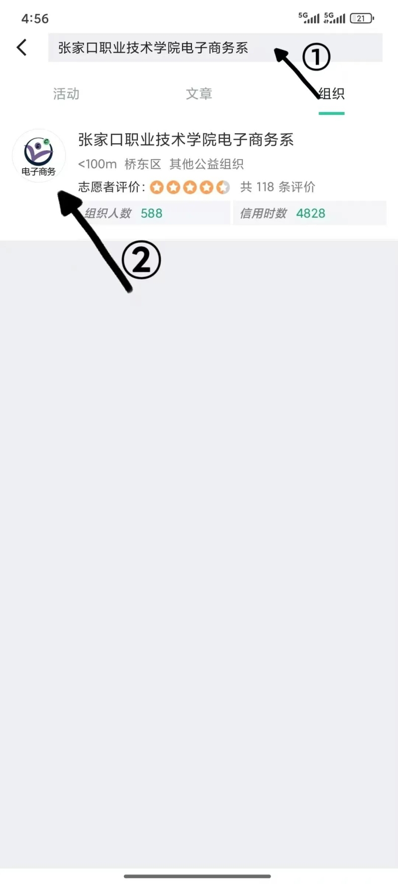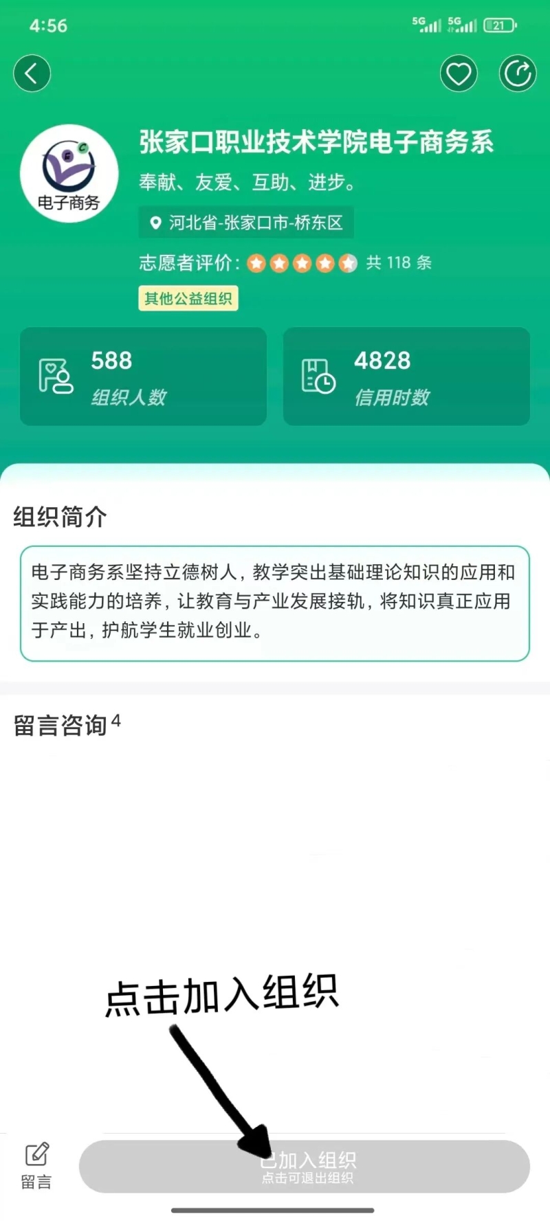 點擊界面左上角修改定位,點擊“找組織”,搜索并選擇“張家口職業技術學院電子商務系”志愿組織,加入組織,等待組織負責人通過即可。