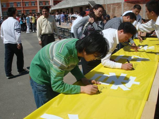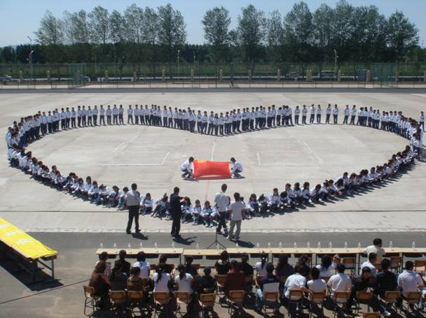 本次活動特邀張家口電視臺、張家口晚報進行宣傳報道。學院領導和高新區民政局有關領導親臨活動現場,陳院長代表學院講話并帶領全體人員向5.12大地震受難同胞表示哀悼,同時對廣大學生提出了殷切的希望和明確的要求。活動中還邀請到震后由我市大北車行安排就業的三十名來自四川德陽災區的受災同胞,他們與我系學生共同表演了《感恩的心》,并接受了我院和高新區民政局共同捐贈的慰問品,災區同胞因此倍感溫暖。隨之,在《讓世界充滿愛》的音樂聲中開始了“為生者祈福、為逝者哀悼”萬人簽名活動,由全校師生在長卷上獻出自己的愛心,送上自己對災區人民的祝福。