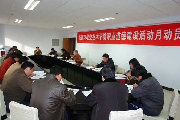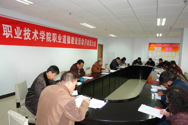 ??? 為進一步提高廣大教職工的職業道德素質,建設一支師德高尚、素質全面、業務精湛、人民滿意的教職工隊伍,不斷推進我院教育事業的健康快速發展,11月10日下午,學院召開中層干部會議,安排部署在全院開展的職業道德建設月活動(11月10日-12月10日)。黨委書記姜銘作動員講話,黨委副書記,常務副院長靳明主持會議。
