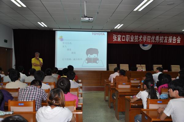 常翰林,原張家口工業交通學校82屆畢業生,現任張家口華鈴豐田汽車銷售服務有限公司董事長。常翰林董事長從自身經歷出發,結合專業知識與自身經歷,圍繞 “創業、創造、創新”、“責任、快樂、價值”、和“協調發展、準時化生產、顧客至上”的企業文化,三個方面進行了詳細的解讀。常翰林學長樸實真摯的話語、深入淺出的講解贏得了同學們一陣陣熱烈的掌聲。