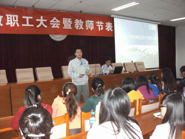 9月21日中午,京東方科技集團(tuán)在我院圖書辦公綜合樓307學(xué)術(shù)報(bào)告廳舉辦了專場招聘會(huì),2013屆畢業(yè)生近400人參會(huì)。京東方科技集團(tuán)招聘專員方帥、高強(qiáng),學(xué)院副院長陳懷勇,就業(yè)指導(dǎo)中心(校企合作處)、機(jī)械工程系、電氣工程系負(fù)責(zé)人出席了專場招聘會(huì)。