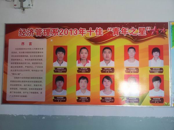 經濟管理系通過本次十佳“青年之星”評選活動,在全系范圍內掀起了向先進學習的熱潮。目前,經濟管理系已在教學樓1樓大廳和學生公寓3號樓前分別制作了十佳“青年之星”宣傳展板,擴大了此次活動的知曉度和影響力,起到了良好的宣傳示范作用。