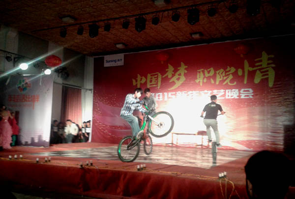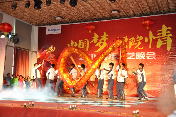 整場演出凸顯“中國夢 職院情”主題,歌舞聲情并茂,或舒緩深情,或奔放激烈,精彩紛呈,高潮迭起。節目形式又有新突破,既有“極限自行車”表演者的高、難、驚、險,又有“舞龍”表演隊的高端、大氣、上檔次,“舞龍”的精彩、完美、激情、騰躍預示著我院一定會在2015年取得新的業績和輝煌!