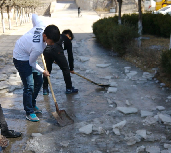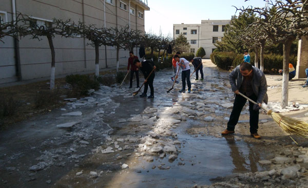 日前,學(xué)院單身教工宿舍樓北側(cè)道路上大面積結(jié)冰,給廣大師生的出行帶來了極大不便。為確保校園路面暢通,防止冰面路滑引發(fā)安全事故,院學(xué)生會組織學(xué)生干部義務(wù)勞動,清除道路積冰。15名學(xué)生會干部利用午休時間開展除冰活動,同學(xué)們用鐵鍬將厚厚的冰層鏟碎、翻開,堆到道路的兩旁,并用掃把將道路上的碎冰塊和積水清掃干凈。院學(xué)生會干部們這種急他人所急,想他人所想,率先垂范的行為起到了模范帶頭作用,弘揚了正能量,為廣大同學(xué)樹立了學(xué)習(xí)的榜樣。