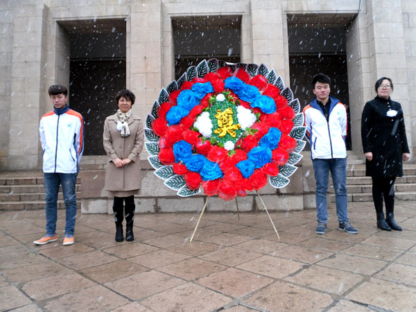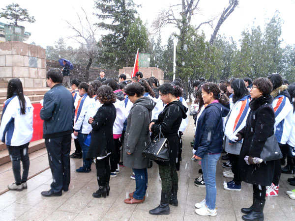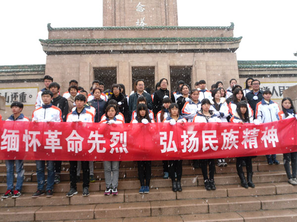 4月2上午,師生們頂著驟降的寒風,冒著紛飛的雨雪,高舉團旗到察哈爾烈士陵園舉行清明祭掃。師生們在英雄紀念碑前肅立默哀,教師和學生代表向烈士敬獻花圈,社科部主任白義作了簡短的發言。