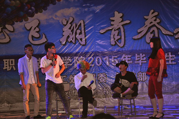 文藝晚會在高亢有力的詩朗誦《畢業驪歌》中拉開序幕,幽雅而莊重的樂韻縈繞會場,猶如璞玉潤澤。接著,男、女獨唱歌曲《愛在天地間》、《盛夏光年》、《用心良苦》、《那些年》、《光輝歲月》、《至少還有你》、《稻香》、《站臺》等一首首熟悉的旋律帶領著觀眾細細回味校園記憶,重溫校園青春。啞劇《理發師》、武術《雙節棍》《軍體操》、小品《青春偶像劇》等節目融入張職院元素,融入大學生活學習的碎片剪影,同學們詼諧幽默的表演,贏得臺下觀眾陣陣笑聲與掌聲。舞蹈《爵士》、《鬼步舞 》表演,歡快熱烈,激情四射,動感的音樂、遒勁的舞姿盡顯青春魅力,沖擊著現場觀眾的視覺和聽覺,并博得陣陣掌聲。雄渾莊重的男生二重唱《有沒有人告訴你》、《一生有你》,唱出了同學間建立起的深厚友情。詩朗誦《畢業組詩》充分展現了畢業生惜別母校的依依不舍之情。