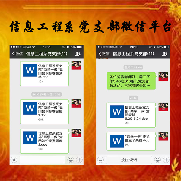 為拓寬廣大黨員的學習教育渠道,信息工程系黨支部建立了“兩學一做”專題微信群,利用新媒體讓組織的聲音、黨員的交流、學習的內容深入到日常生活中,開辟了“兩學一做”學習教育的新陣地,營造了濃厚的學習氛圍。