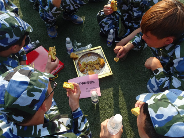 系領(lǐng)導(dǎo)與輔導(dǎo)員一起,利用課間、軍訓(xùn)休息等時(shí)間,來(lái)到教室、宿舍、操場(chǎng)上,為同學(xué)們送去象征幸福美滿(mǎn)的團(tuán)圓餅,大家共同品嘗著甜美的月餅,分享著溫暖美好的時(shí)刻。