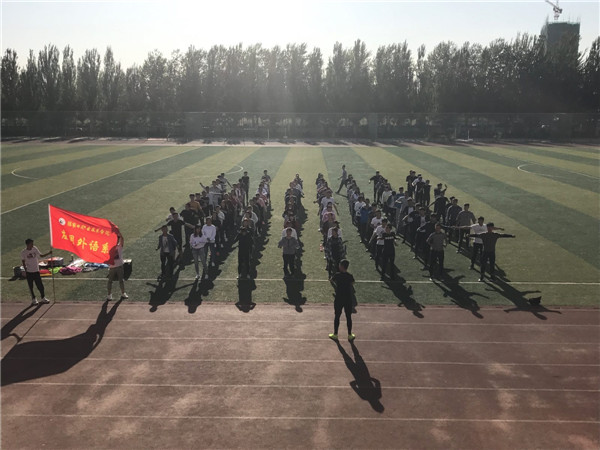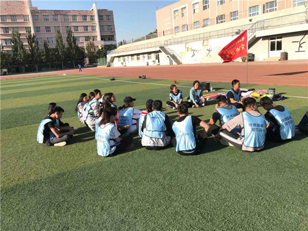 活動伊始,由系文體部部長帶領新生進行熱身運動,完成了“歸堆抱團”的集體項目。在拓展訓練中,同學們被隨機分成5組,并按要求在15分鐘之內選出隊長、隊秘、旗手,以及設計完成隊名、隊徽、隊訓等。之后開展了“一路到底”、“接桿游戲”以及“青蛙蹲”等拓展項目訓練,活動中同學們積極參與、熱情高漲。隊內的相互配合和對外的相互競爭,使大家既體驗到協作、勇氣、戰勝自我帶來的成功喜悅,又深刻感受到信任、協作、責任的精神。