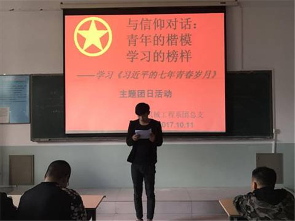 為了進一步引領青年學生樹立正確的世界觀、人生觀、價值觀,10月11日,機械工程系團總支組織團學干部、優秀團員以及16級、17級全體學生舉辦了“青年的楷模 學習的榜樣”——學習《習近平的七年知青歲月》為主題的團日活動。