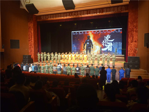 《逆行者》作為中國首部消防題材浸入式話劇,是張家口支隊結合全國“關注消防?平安你我”的消防宣傳主題,精心策劃制作而成。整部話劇時長1小時15分鐘,全景展現了消防部隊的執勤訓練、監督執法、滅火救援以及官兵的情感生活。逼真的舞臺效果、全新的視聽感受、感人的故事情節,使演出現場不斷爆發出一陣陣熱烈的掌聲。豐盛的消防文化大餐給現場學生們帶來歡笑的同時也令大家流下了感動的淚水。
