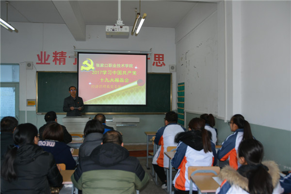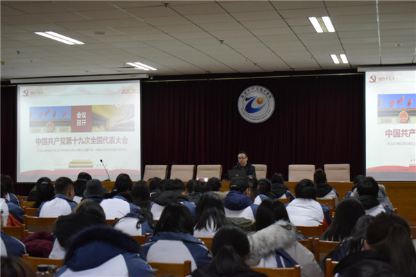 11月23日下午,經濟管理系組織學生300多人集中收聽十九大報告解讀,邀請學院社科部宋輝老師授課,經濟管理系黨支部書記郭獻崇主持,系部團總支書、各班輔導員參加。