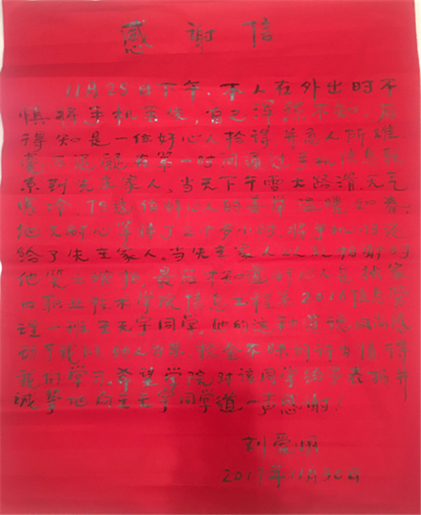 11月25日下午,信息工程系2016級學生王天宇同學撿到一部手機,他通過手機號碼聯系上失主,當天大雪路滑,他一直在外面等待三個多小時,最終物歸原主,失主要以禮感謝,王天宇同學笑之婉拒匆匆離開。之后,失主在我市多所學校打聽,才得知這位好心的青年是我院信息工程系2016信息管理專業1班的學生王天宇。王天宇同學表現出的拾金不昧精神,彰顯了高尚的道德情操和人格力量,是新時期雷鋒精神的再現。