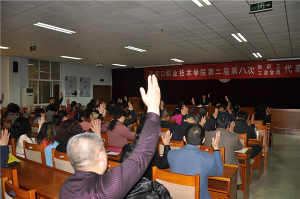 大會以舉手表決的方式通過了關(guān)于2017年學(xué)院工作報告的決議、關(guān)于張家口職業(yè)技術(shù)學(xué)院國有資產(chǎn)管理規(guī)定的決議、關(guān)于張家口職業(yè)技術(shù)學(xué)院預(yù)算管理辦法的決議、關(guān)于張家口職業(yè)技術(shù)學(xué)院2018年度獎勵性績效工資實(shí)施方案的決議、關(guān)于學(xué)院2017年度工會工作報告的決議和關(guān)于工會經(jīng)費(fèi)審查報告的決議。