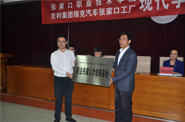 吉利集團領克汽車張家口工廠副總經理畢國歌向學院授“人才培養基地”牌。