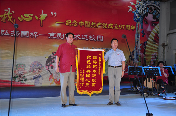 學(xué)院黨委書記胡煒向德藝京劇社贈(zèng)送錦旗。