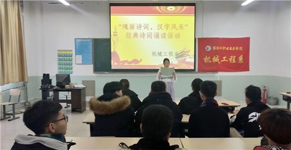 12月12日,機械工程系還舉辦了“瑰麗詩詞,漢字風采”經典詩詞誦讀活動,通過對《沁園春·雪》和《七律·人民解放軍占領南京》等一首首激情豪邁、耐人尋味的詩詞的誦讀,激發學生積累詩詞的興趣和練習誦讀的熱情,養成多讀經典、會讀經典的良好習慣,進一步推進學校文化建設。