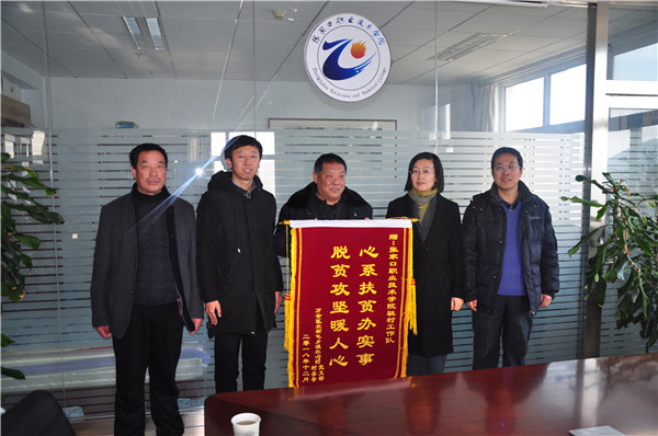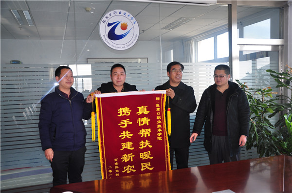 1月7日上午,學院圖書綜合樓601會議室里氣氛熱烈,掌聲不斷,我院對口精準幫扶萬全區北新屯鄉領導和新河口村、北新屯村、溫北溝村的書記、主任手捧錦旗交到了學院黨委書記胡煒、院長王立秋、紀委書記史慧武手中。鄉、村領導感謝我院在精準扶貧工作中做出的突出貢獻!