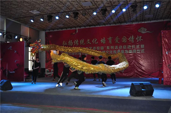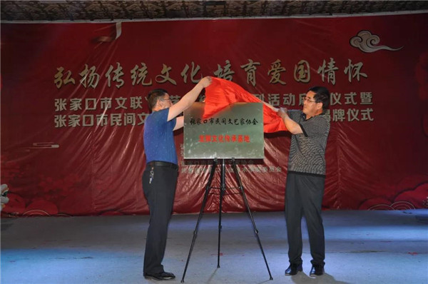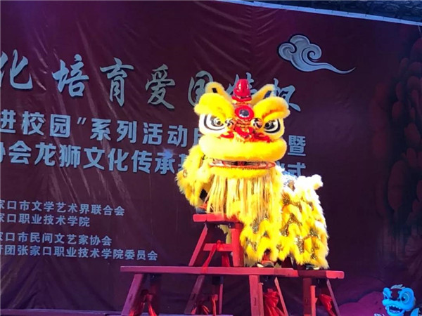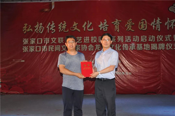 市民間文藝家協會主席吳桐、星火龍獅團成員張辰作為文藝志愿者代表、學生代表先后發言;路廣平與學工處負責人為張家口市民間文藝家協會“龍獅文化傳承基地”揭牌;李煒杰為龍獅文化傳承基地總教練冀澤民頒發聘書。