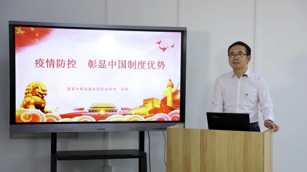 “共克時艱,戮力同行,張家口職業技術學院‘疫情’之下思政第一課,現在開課,請同學們起立,升國旗,唱國歌......”。上午8時00分,我院線上教育開學第一課正式啟動,學院領導同全院師生一起舉行隔空升國旗儀式。
