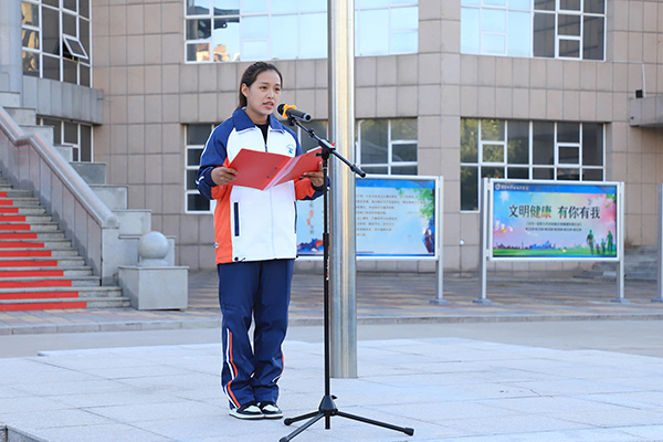 清晨7時15分,在綜合行政樓前廣場,由9名學生組成的國旗護衛(wèi)隊邁著鏗鏘有力的步伐護衛(wèi)國旗步入會場。伴隨著雄壯的國歌,在全體師生的注目致禮中,鮮紅的五星紅旗徐徐升至桿頂,迎風飄揚。