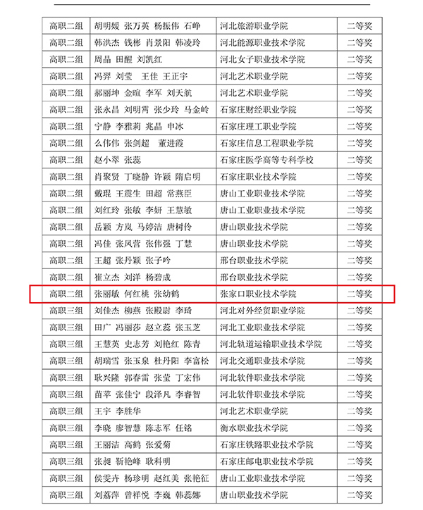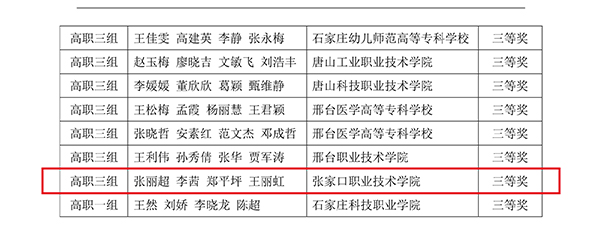 日前,河北省教育廳正式公布2020年河北省職業(yè)院校技能大賽教學(xué)能力比賽結(jié)果。在全省職業(yè)院校493支參賽團(tuán)隊(duì)中,我院六支參賽隊(duì)伍表現(xiàn)優(yōu)異,共奪得二等獎(jiǎng)一項(xiàng)、三等獎(jiǎng)四項(xiàng)和優(yōu)秀獎(jiǎng)一項(xiàng)。