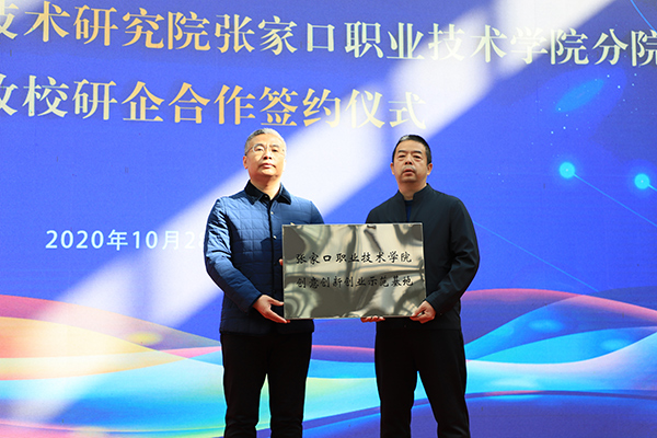院長王立軍為博創(chuàng)智造孵化器授張家口職業(yè)技術(shù)學(xué)院創(chuàng)意創(chuàng)新創(chuàng)業(yè)示范基地牌匾。
