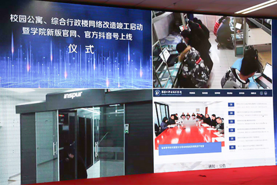 12月15日,學院校園公寓、綜合行政樓網絡改造竣工啟動暨學院新版官網、官方抖音號上線儀式在綜合樓三樓報告廳舉行。學院黨委書記馮印濤、院長王立軍、中國聯通張家口分公司總經理仝博、西安新路網絡科技有限公司總經理韓軍在大屏幕上按下手印,共同啟動校園公寓、綜合行政樓網絡,為學院新版官網、官方抖音號正式上線助推。