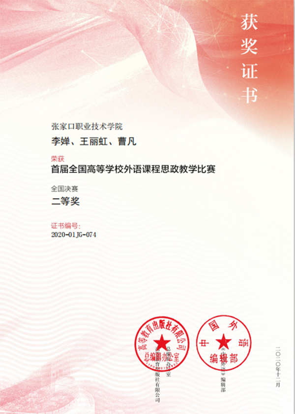 本屆全國(guó)高等學(xué)校外語(yǔ)課程思政教學(xué)比賽由高等教育出版社和《中國(guó)外語(yǔ)》編輯部主辦。李嬋、王麗虹、曹凡三位教師組成的張職院參賽團(tuán)隊(duì)經(jīng)過(guò)激烈角逐,最終戰(zhàn)勝一系列強(qiáng)手,奪得高職組二等獎(jiǎng)。