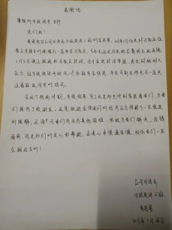 目前,我院滯留石家莊的105名學生心理與思想穩定,生活無憂,大家對學院各級給予的關心關愛表示感謝,對戰勝疫情充滿信心。同時,學院也將持續關注滯留學生的身心健康和生活情況,繼續開展有溫度、有力度、有深度的幫扶活動,全力幫助學生們順利渡過難關,共同打贏疫情殲滅戰。