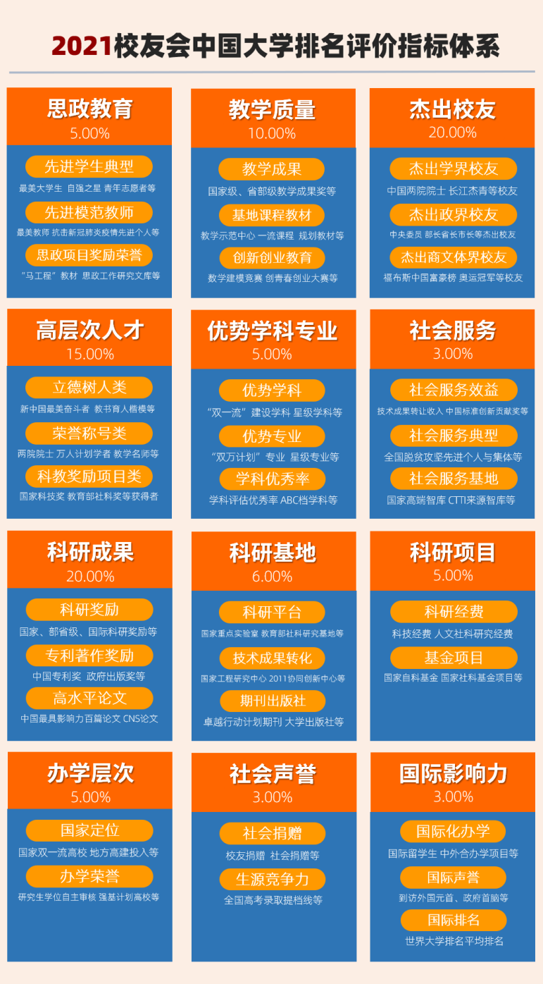 校友會2021中國大學排名評價指標體系由思政教育、教學質(zhì)量、杰出校友、高層次人才、優(yōu)勢學科專業(yè)、科研成果、科研項目、科研基地、社會服務、辦學層次、社會聲譽、國際影響力等12個一級指標構(gòu)成,以服務國家“雙一流”發(fā)展戰(zhàn)略和提升高校服務國家地方經(jīng)濟社會發(fā)展能力為導向,涵蓋中國高校五大核心職能的600多項具有代表性的評測指標,涵蓋了國內(nèi)外其他大學排名的高端質(zhì)量指標。