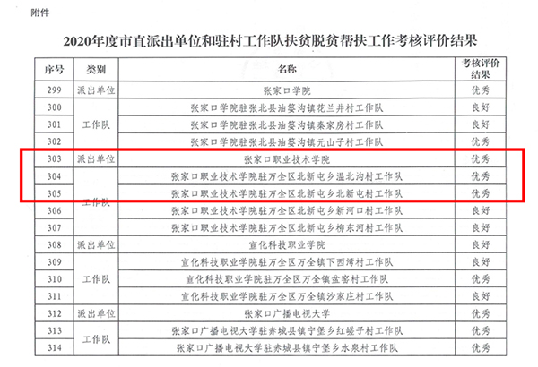 近日,中共張家口市委組織部下發《關于2020年度市直派出單位和駐村工作隊扶貧脫貧幫扶工作考核評價結果的通報》,我院作為派出單位被評為優秀等次,我院駐萬全區北新屯鄉溫北溝村工作隊、北新屯村工作隊被評為優秀等次。