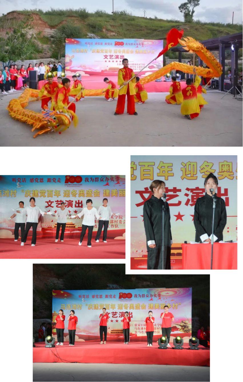 馬連灘村干部群眾和學院師生同臺獻上自編自導的文藝節目,氣氛溫馨熱烈。在我院星火龍獅團帶來的《中國龍》表演中,表演者騰飛跳躍,龍頭高聳似沖云端,忽而低下,又象蛟龍入海破浪潛行。學生們高低揮舞,蜿蜒盤旋的精湛表演,給現場觀眾帶來了強烈視覺沖擊與精神激勵;舞蹈《中國紅》《過新年》《絨花》以流暢輕盈的躍動,變換出不同的舞姿,演繹出人民群眾喜悅與幸福的情感;歌曲《少年》《我相信》《精忠報國》這些廣為傳唱的旋律,引發大家共鳴,不少村民齊聲哼唱,表達了自己立志投身鄉村振興的豪情;詩朗誦《七月,中國的選擇》《我是共產黨員我沒有忘記》《希望,展翅飛翔》把大家帶回了中國共產黨誕生的歷史時刻,帶領全場群眾感受開天辟地的歷史瞬間,表達了朗誦者建設家鄉,永遠跟黨走的心聲;相聲《一聲吆喝》則以別致新穎的選題,風趣幽默的表演,贏得現場笑聲陣陣,掌聲不斷;《燈火里的中國》以喜聞樂見的歌舞形式,完美詮釋了中國人民對美好幸福生活的向往,表達了人民群眾熱愛黨,熱愛祖國,熱愛社會主義的深情。在全場的熱烈掌聲中,整場演出圓滿落下帷幕。??