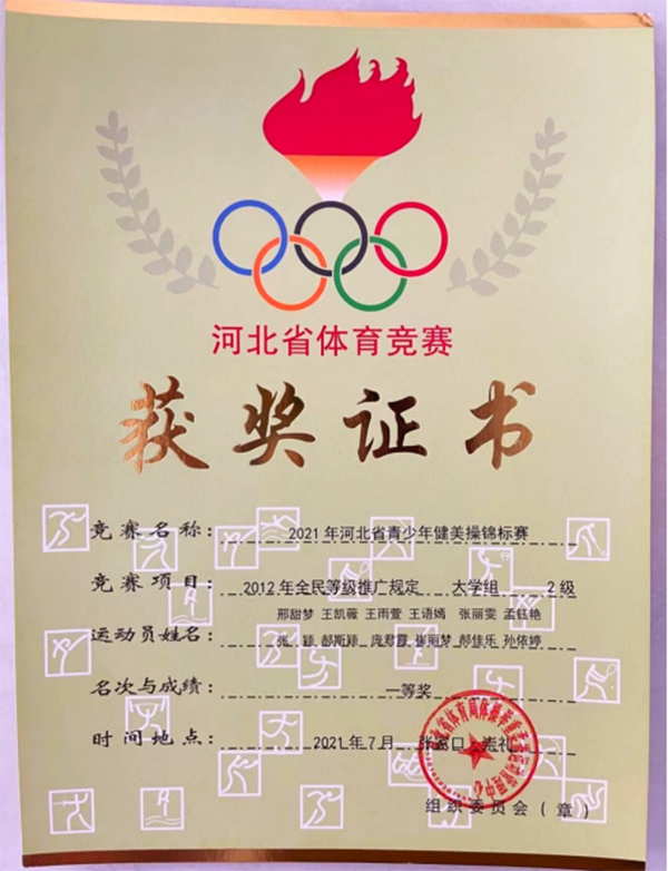 暑假期間,由省體育局舉辦的“2021年河北省青少年健美操錦標(biāo)賽”落下帷幕,共有來(lái)自全省的30支代表隊(duì)近千人參賽。其中,我院12名學(xué)生組成的“冰激靈”健美操代表隊(duì)在此次比賽中發(fā)揮出色,脫穎而出,榮獲“河北省健美操錦標(biāo)賽全民推廣規(guī)定組合大學(xué)組”一等獎(jiǎng)的好成績(jī)。