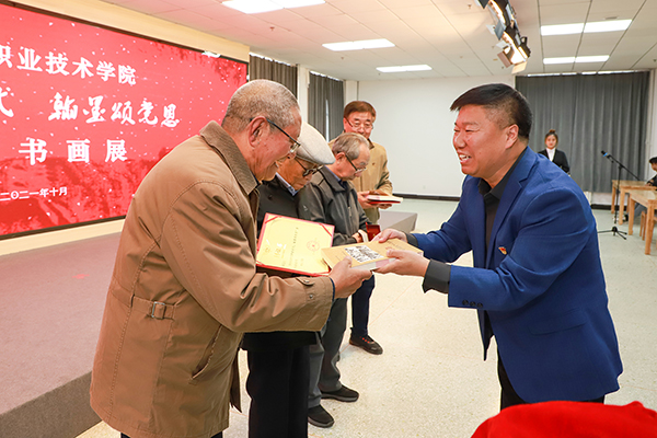 在隨后進(jìn)行的重陽書畫展開展儀式上,學(xué)院黨委副書記楊汝明為參展老教師頒發(fā)了榮譽證書。