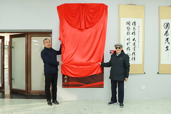 院長王立軍與退休老教師劉全德共同為書畫展揭幕。