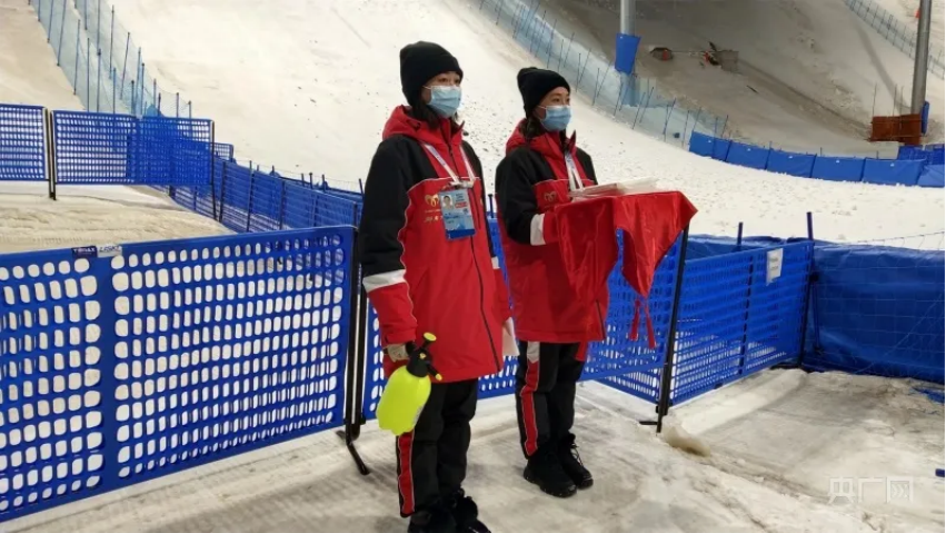 ????這次測試活動是白天晚上都有比賽。每場比賽前金銘鈺和志愿者們都要勘察場地、規(guī)劃路線、分配人員、確定位置;他們要在光滑的雪地里搬運(yùn)百公斤重的頒獎臺;還要對現(xiàn)場所有的物資進(jìn)行全面消毒,再擺放整齊……而且這些工作都必須在比賽間歇以最快的速度完成。每一場比賽,志愿者們都要在寒風(fēng)中站立三四個(gè)小時(shí),他們身上和腳底的暖貼都沒了溫度,雙腿麻木至沒有知覺,全身都凍透了,眼睛被白雪刺激的酸痛流淚,而且崇禮的紫外線很強(qiáng),幾天下來,金銘鈺和志愿者們都變成了“口罩臉”。但他們不說一句苦,不喊一句累,大家都以最飽滿的熱情、最專業(yè)的水平、最溫暖的服務(wù),默默地做著看似微不足道的事情。