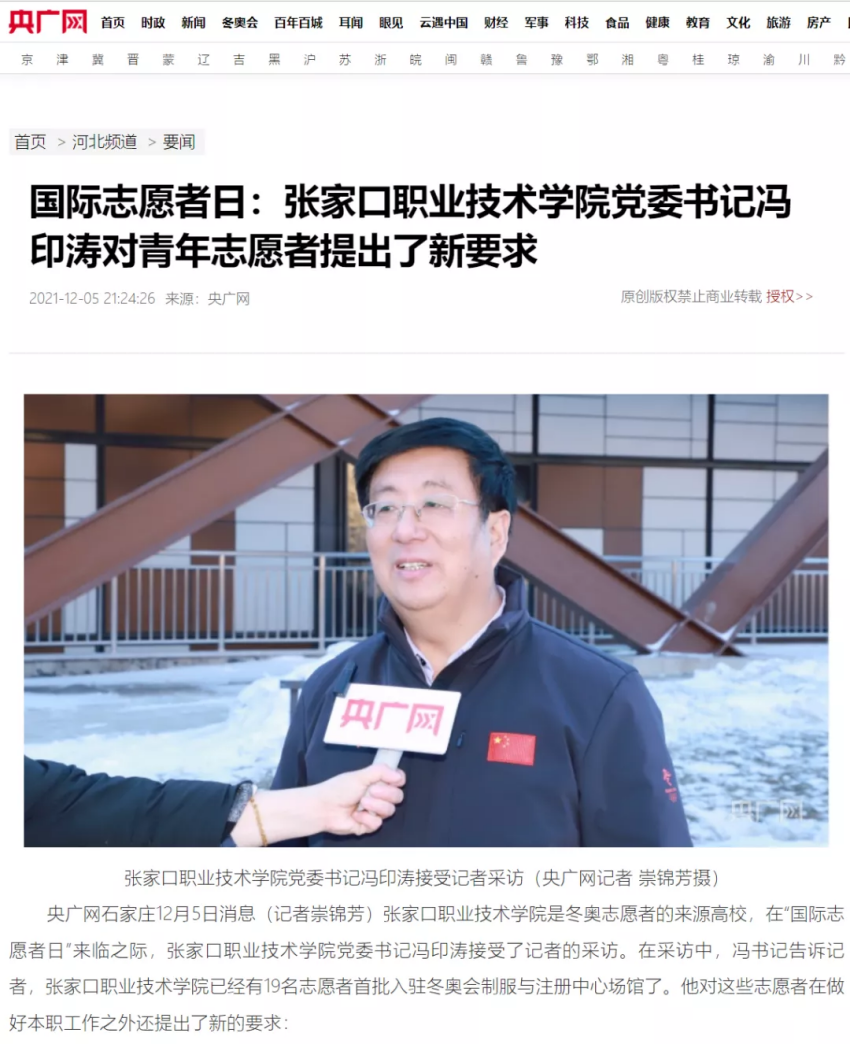 央廣網石家莊12月5日消息(記者崇錦芳)張家口職業技術學院是冬奧志愿者的來源高校,在“國際志愿者日”來臨之際,張家口職業技術學院黨委書記馮印濤接受了記者的采訪。在采訪中,馮書記告訴記者,張家口職業技術學院已經有19名志愿者首批入駐冬奧會制服與注冊中心場館了。他對這些志愿者在做好本職工作之外還提出了新的要求: