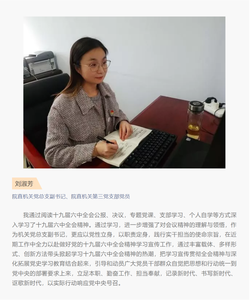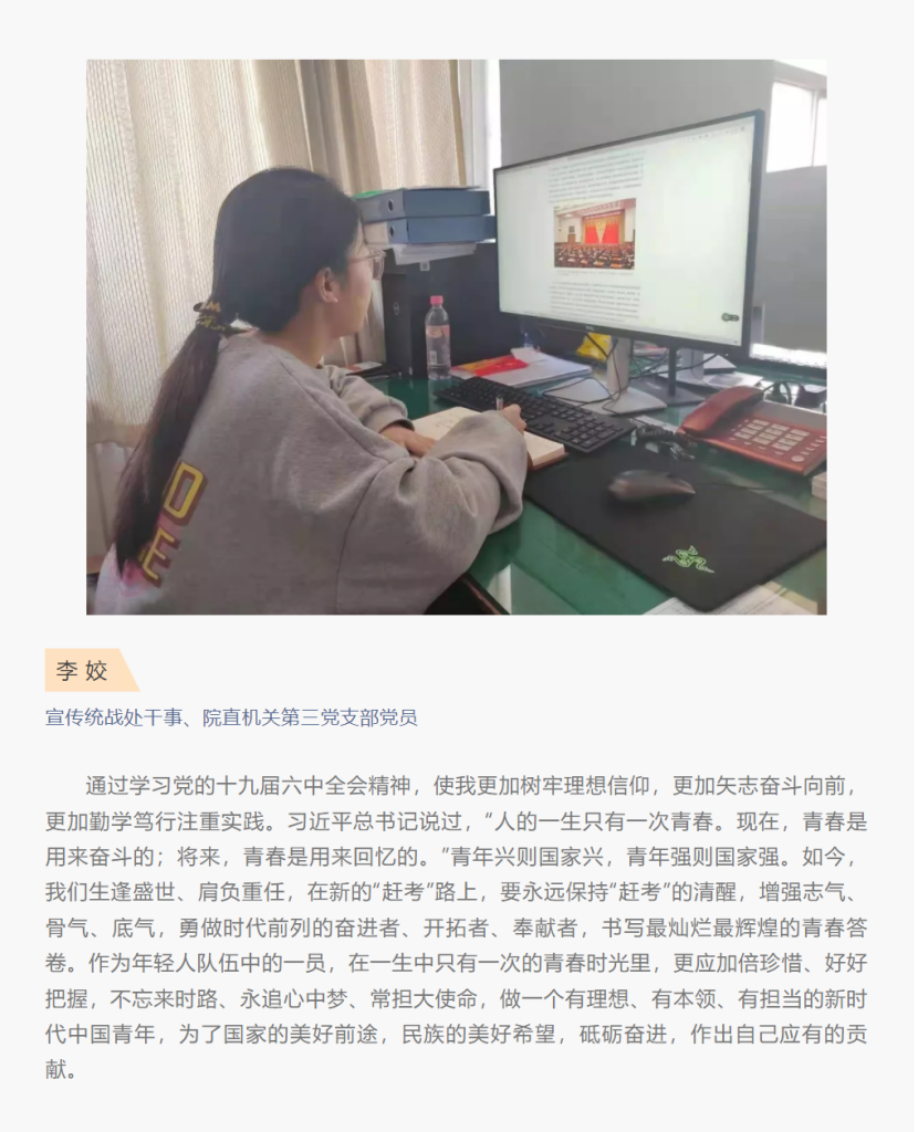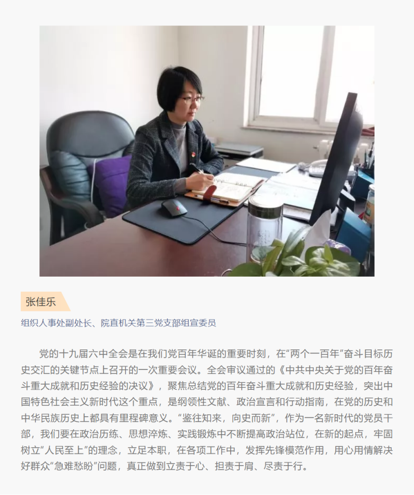 為進一步加強黨組織建設(shè),提升黨建工作水平,發(fā)揮行政支部的戰(zhàn)斗堡壘作用。近期,院直機關(guān)第三黨支部以線上線下多種方式先后組織支部黨員學(xué)習領(lǐng)會黨的十九屆六中全會精神,并撰寫心得體會。以學(xué)促行,以行見效,把全會精神運用在工作中,為學(xué)院新時代高水平高職院校建設(shè),作出更大貢獻,以更加優(yōu)異的成績迎接黨的二十大召開。