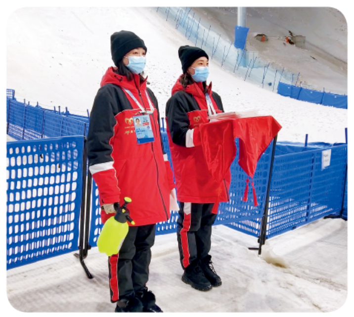 “上崗之前,專家已經(jīng)帶著我們進行了多次練習,但因為是疫情期間的比賽,還是多出很多不確定性。我們就集思廣益,從一開始嘗試引導式(接觸式)頒獎、無頒獎,到最后決定采取無接觸式頒獎模式——志愿者們先把頒獎物資擺好,一一消毒后撤離,頒獎嘉賓和運動員再上場使用。”因為現(xiàn)場頒獎物資有限,A、B、C三個測試賽區(qū)共用頒獎臺資源,金銘鈺他們就必須在比賽活動間隙,用最快的速度來回移動頒獎臺?!懊總€頒獎臺有50多公斤重,還是走路面情況復(fù)雜的雪道,我們就得趕緊跑?!泵繄鰷y試活動前,他們都要反復(fù)踏勘場地,仔細規(guī)劃路線,精準分配每個人的位置,確保流程上不出紕漏。