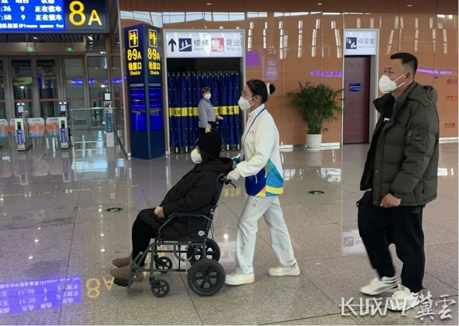 侯京奧為出行不便的旅客推輪椅進站。本人供圖