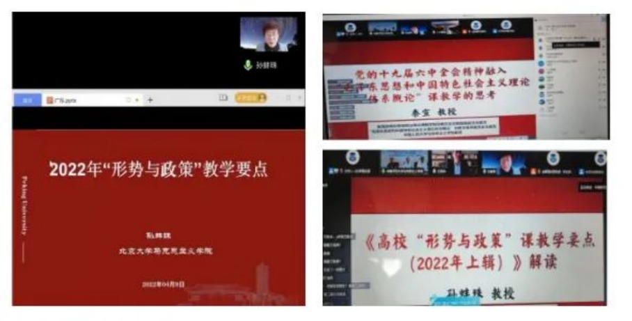 全體教師認真聆聽了武漢大學黨委副書記、教授沈壯海主講的《黨的十九屆六中全會精神融入“思想道德與法治”課教學的思考》、清華大學馬克思主義學院院長、教授艾四林主講的《黨的十九屆六中全會精神融入“馬克思主義基本原理”課教學的思考》、北京大學馬克思主義學院黨委書記、教授孫蚌珠主講的《高校“形勢與政策”課教學要點(2022年上輯)》解讀、中國人民大學馬克思主義學院教授秦宣主講的《黨的十九屆六中全會精神融入“毛澤東思想和中國特色社會主義理論體系概論”課教學的思考》、清華大學馬克思主義學院教授王憲明主講的《黨的十九屆六中全會精神融入“中國近現代史綱要”課教學的思考》、北京科技大學黨委宣傳部部長、教授彭慶紅主講的《2022年全國兩會精神解讀》。六位教授對相應內容進行了詳細闡述,講授主題鮮明,內容深刻。