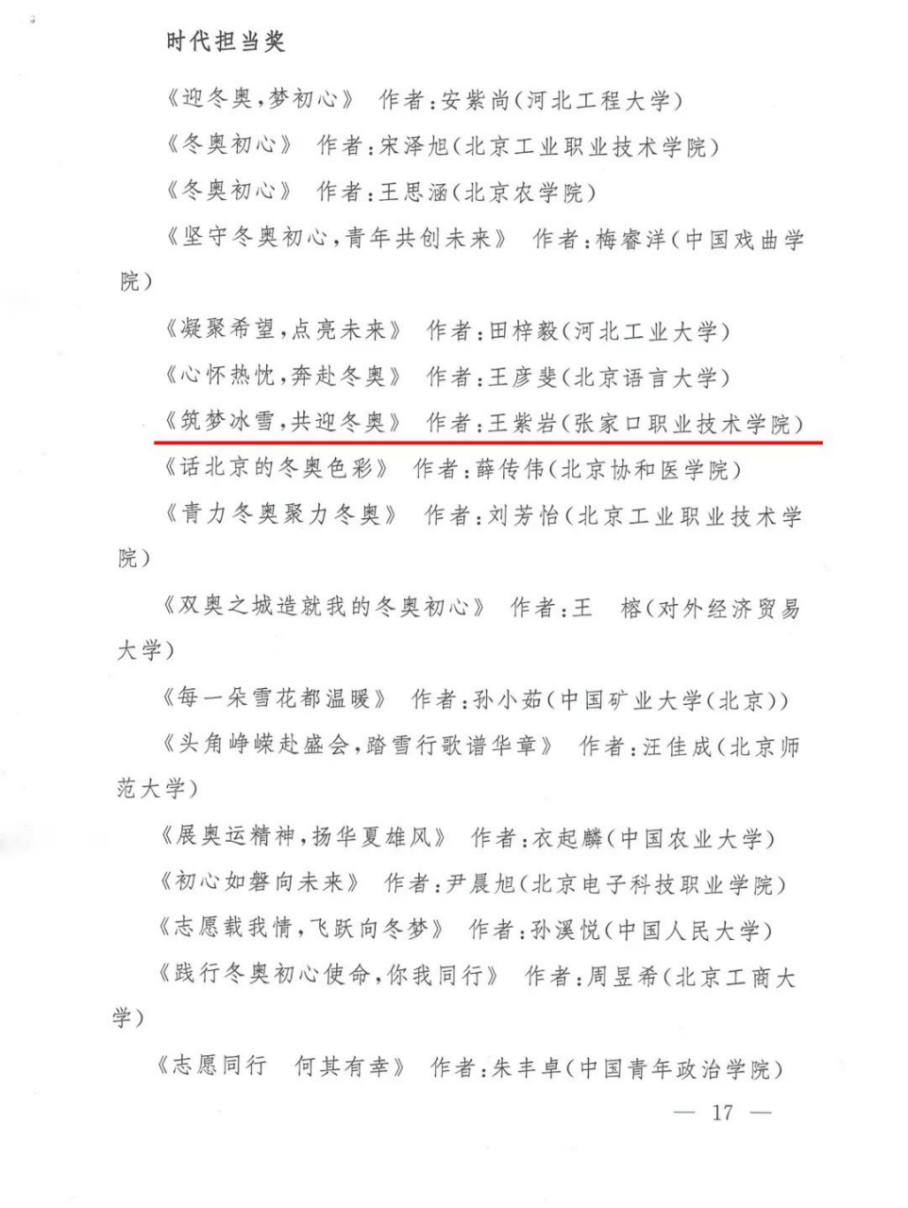 近日,在由北京冬奧組委志愿者部、北京團市委、河北團省委共同舉辦的“奔向冬奧 志愿者在準備”賽會志愿者儲備力量綜合素養(yǎng)提升活動中,經(jīng)綜合考核評定,我院與清華大學(xué)等27所總體組織情況較好、成績突出的高校被授予“優(yōu)秀組織獎”。同時,來自機電工程學(xué)院的學(xué)生王紫巖在“冬奧初心征文”比賽中榮獲“時代擔(dān)當(dāng)獎”。