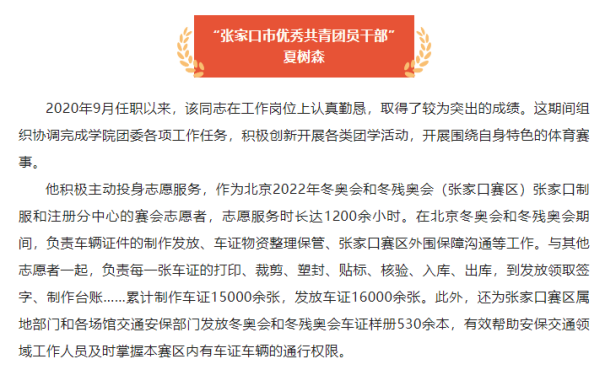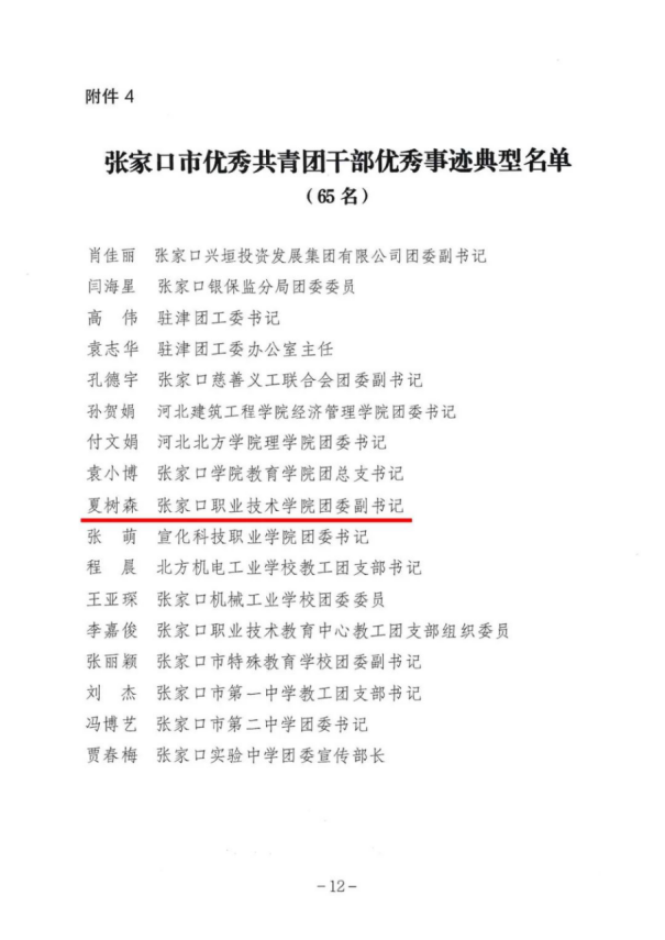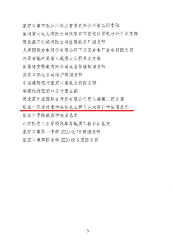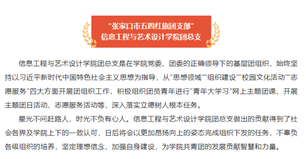 青春心向黨、建功新時代。日前,共青團張家口市委印發《關于選樹2021年度全市“五四紅旗團委(團支部)”“優秀共青團員”“優秀共青團員干部”“新長征突擊手”事跡典型的決定》。我院信息工程與藝術設計學院團總支榮獲“張家口市五四紅旗團支部”稱號;2020級團屬學生組織干部李文杰榮獲“張家口市優秀共青團員”稱號;學院團委副書記夏樹森榮獲“張家口市優秀共青團干部”稱號;專任教師李月婷榮獲“張家口市新長征突擊手”稱號。