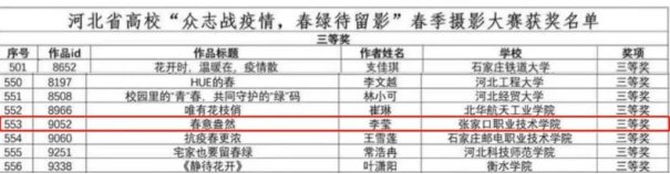 日前,由河北省高校網(wǎng)絡(luò)思想政治工作中心主辦的“眾志戰(zhàn)疫情,春綠待留影”春季攝影大賽公布獲獎名單,我院學(xué)生楊佳攝影作品“如約”榮獲二等獎、李瑩攝影作品“春意盎然”榮獲三等獎。