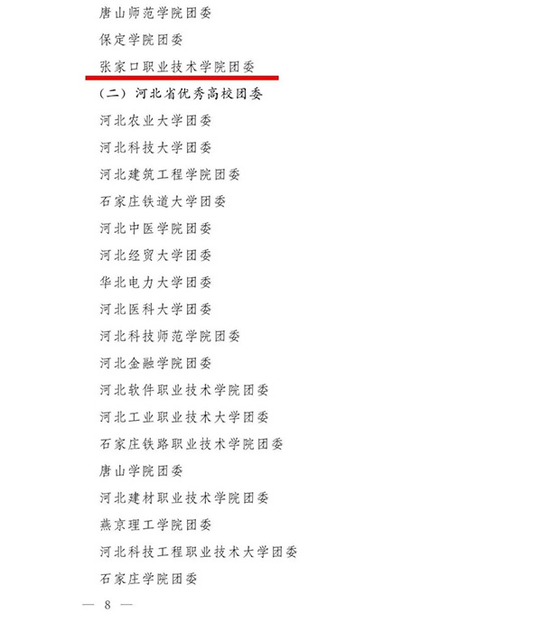 近日,共青團河北省委辦公室下發《關于2022年度全省共青團述職考核結果的通報》,經擇優評選、逐級推報、嚴格審核、述職考評,張家口職業技術學院團委獲評2022年度“河北省十佳高校團委”稱號。