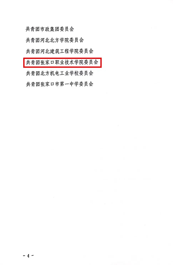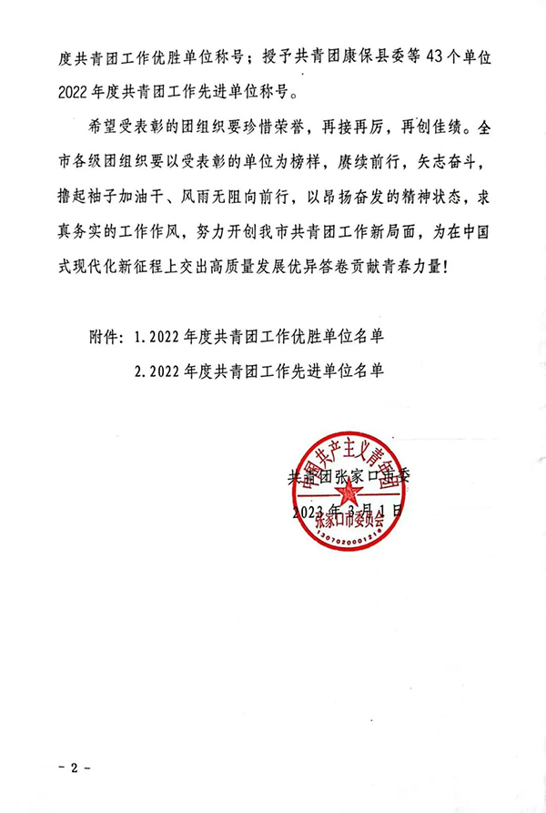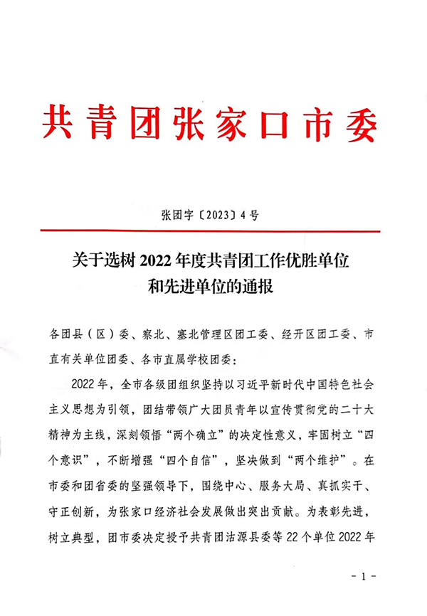 近日,共青團(tuán)張家口市第十九屆三次全委(擴(kuò)大)會(huì)議召開(kāi)。會(huì)議總結(jié)了2022年工作情況,部署了2023年重點(diǎn)工作,表彰了2022年度共青團(tuán)工作優(yōu)勝單位和先進(jìn)單位。我院榮獲2022年度共青團(tuán)工作優(yōu)勝單位。