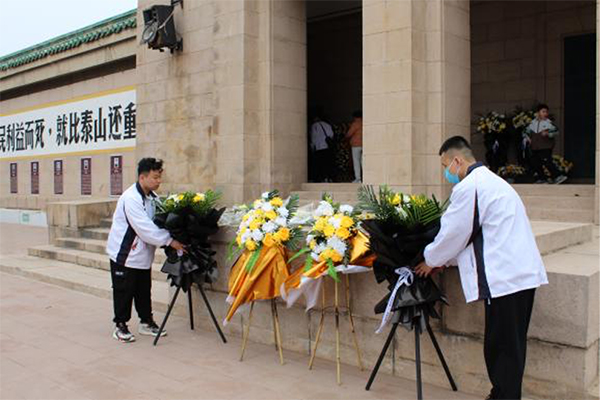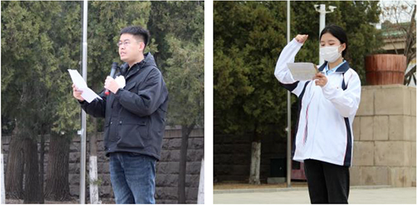 青年教師代表賈斌,在紀念塔前進行發言,呼吁廣大青年學子珍惜先烈們用鮮血換來的和平歲月,不忘先烈遺志,紅心永鑄,甘當炬火照亮人民與祖國前行的道路。學生代表朱思臻帶領祭掃師生宣誓,聲聲飽含革命精神和致敬英雄的誓詞在肅穆的陵園激蕩、回響。