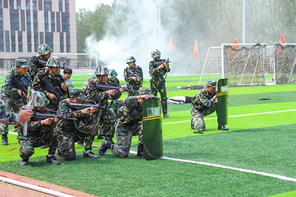反恐防暴應急演練展現了一場酣暢淋漓的對敵戰術突擊的戰斗場面,更是精彩紛呈,令人震撼。參訓同學們扮演的敵我雙方緊張對決,你攻我守,滾滾硝煙、炮聲隆隆的模擬戰斗環境彷佛將全場師生帶入了真實的戰爭場面。
